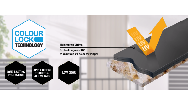 Hammerite Ultima Metal Paint has a special Colour Lock Technology. This technology with enhanced UV protection ensures long-lasting color and gloss retention.